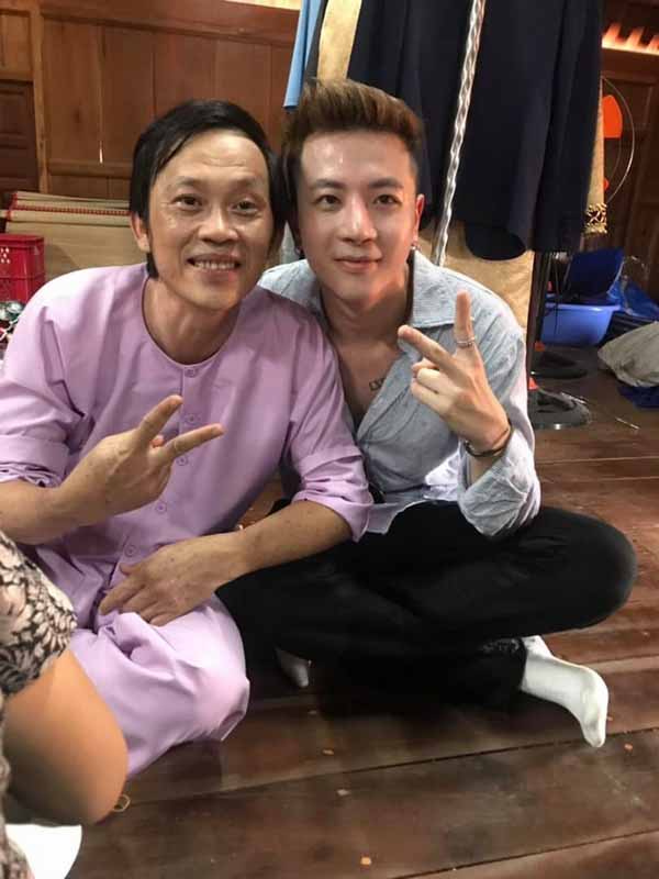 Nghệ sĩ Hoài Linh bên diễn viên trẻ Phí Ngọc Hưng ở nhà thổ Tổ nghiệp. Diễn viên trẻ đến cúng Tổ nghiệp tại nơi Hoài Linh xây dựng, làm chủ trì.