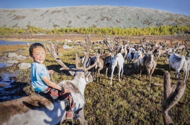 Một chú bé thuộc bộ tộc Tsaatan đang cưỡi tuần lộc trên cánh đồng rộng mênh mông – Ảnh: The Diplomat