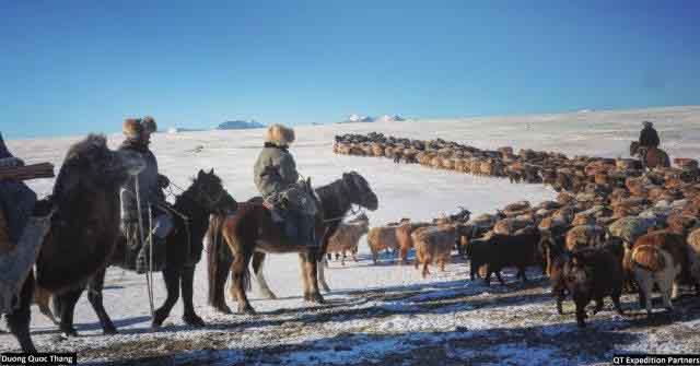 Thợ săn Beksih cùng các con trai và đoàn gia súc trong chuyến di cư mùa xuân 2016 – Ảnh: QT Expedition Partners