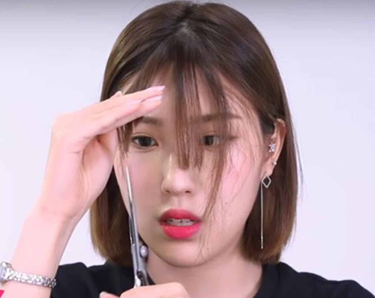 Nếu muốn cắt tóc mái, bạn lấy một lọn tóc nhỏ ở chính giữa trán, sao cho chân của lọn tóc tạo thành hình mũi tên đối xứng. Sau đó, bạn cột gọn lọn tóc này lại, phần tóc còn lại búi gọn gàng và cắt thôi, lưu ý nên cắt qua lông mày một tí sẽ nhìn hài hòa hơn.
