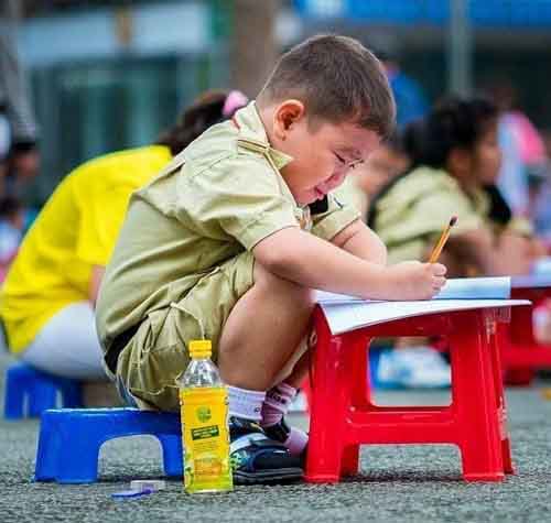 Hình ảnh sĩ tử nhí bụ bẫm khóc mếu khi làm bài thi lên bậc tại công viên này đã nhận được hàng nghìn lượt yêu thích và bình luận chỉ sau vài giờ đăng tải trên nhóm nhiếp ảnh ‘Vietnam Street Photography‘.