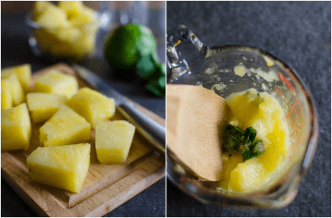 Cho dứa đã cắt miếng vào bình hoặc ly to sau đó dùng thìa gỗ dầm nhỏ. Không nên xay vì như thế dứa sẽ bị nhuyễn quá. Sau đó cho lá bạc hà vào dầm cùng.