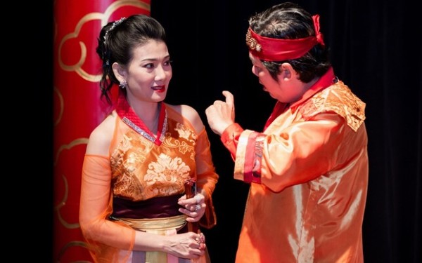Mỹ Uyên (trái) – giám đốc nhà hát 5B Võ Văn Tần – trong vở “Công lý như mặt trời”. Ảnh: Nhân vật cung cấp