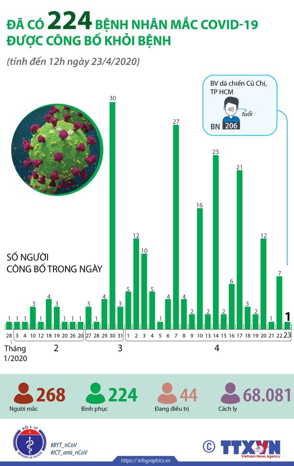 Bệnh nhân công bố được chữa khỏi hôm nay là bệnh nhân 206: nam, quốc tịch Việt Nam, 48 tuổi. Bệnh nhân này nhập viện ngày 30/3/2020. Bệnh nhân được xét nghiệm và có kết quả xét nghiệm âm tính với virus SARS-CoV-2 nhiều lần. Xét nghiệm gần đây nhất vào ngày 20 và 22/4/2020 đều có kết quả âm tính.