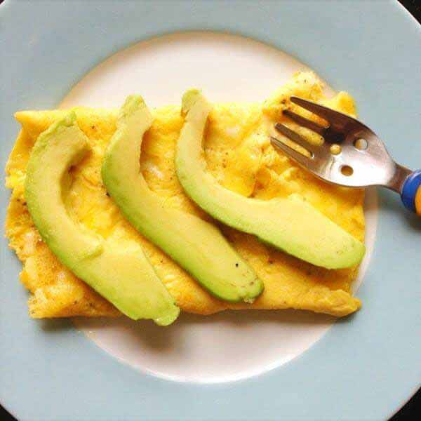 Xếp các lát bơ đẹp mắt bên trên phần trứng và khéo léo gập đôi phần trứng lại. Trở mặt trứng để bơ bám chặt vào phần trứng. Đến khi 2 mặt trứng đã vàng thì cho ra đĩa, cho một ít rau và thưởng thức.