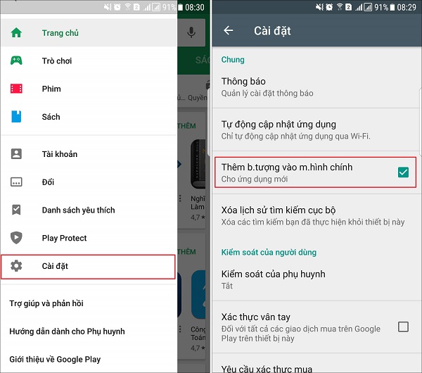 Nếu bạn không tìm thấy tùy chọn này theo cách trên, bạn chỉ cần mở Play Store (CH Play), bấm nút trình đơn (hình ba dấu gạch ngang) ở phía trên góc trái, và chọn Settings (Cài đặt). Cuối cùng, bạn tìm đến mục Add icon to Home screen (Thêm b.tượng vào m.hình chính) và bỏ chọn nó.