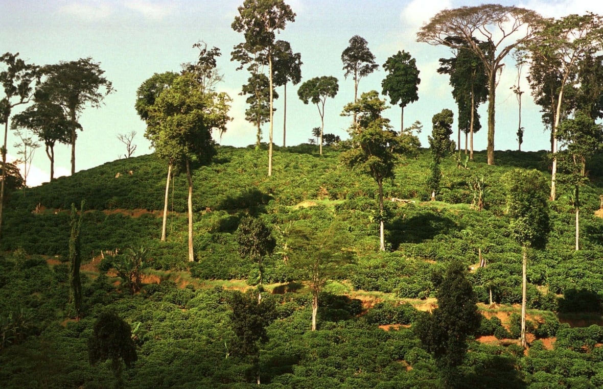 Những cây cà phê bao phủ một sườn đồi ở Camaca, Brazil vào tháng 4 năm 2000. Chúng được trồng xen kẽ giữa những cây cổ thụ cho bóng mát, chắn gió và tránh xói mòn. Nông lâm kết hợp được coi là một trong những giải pháp cho các vấn đề sử dụng đất liên quan đến biến đổi khí hậu. (Douglas Engle / Associated Press)