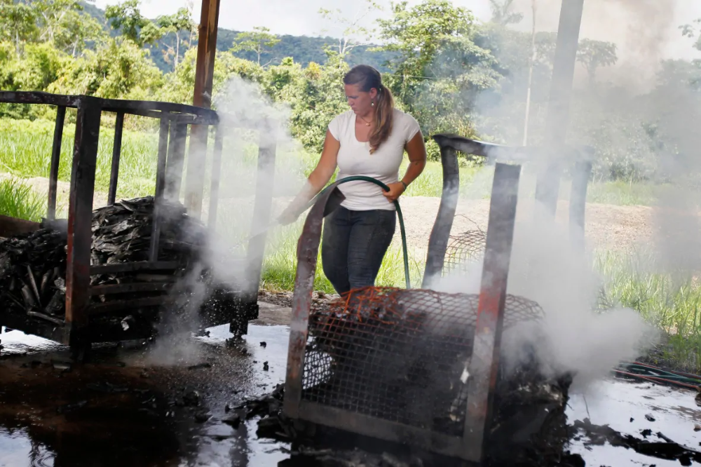 Tình nguyện viên người Mỹ Heather Nobert đang làm nguội than sinh học được tạo ra từ lò đốt ở Pilcopata, Peru vào tháng 12 năm 2014. (Enrique Castro-Mendivil / Reuters)