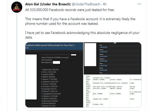 Alon Gal viết trên Twitter: “Tất cả 533 triệu hồ sơ Facebook vừa bị rò rỉ miễn phí. Điều này có nghĩa là nếu bạn có tài khoản Facebook, rất có thể số điện thoại được sử dụng cho tài khoản đã bị rò rỉ. Tôi vẫn chưa thấy Facebook thừa nhận sự sơ suất với dữ liệu của bạn“