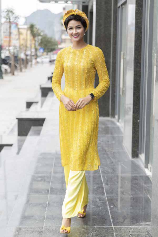Top 5 Hoa hậu Hoàn Vũ 2019 gây ấn tượng trong sự kiện trao học bổng Nâng bước đến trường, thắp sáng tương lai tại Quảng Ninh. H’Hen Niê mặc áo dài nổi bật, cô chọn đôi giày ton-sur-ton giá chỉ 80.000 đồng để di chuyển.