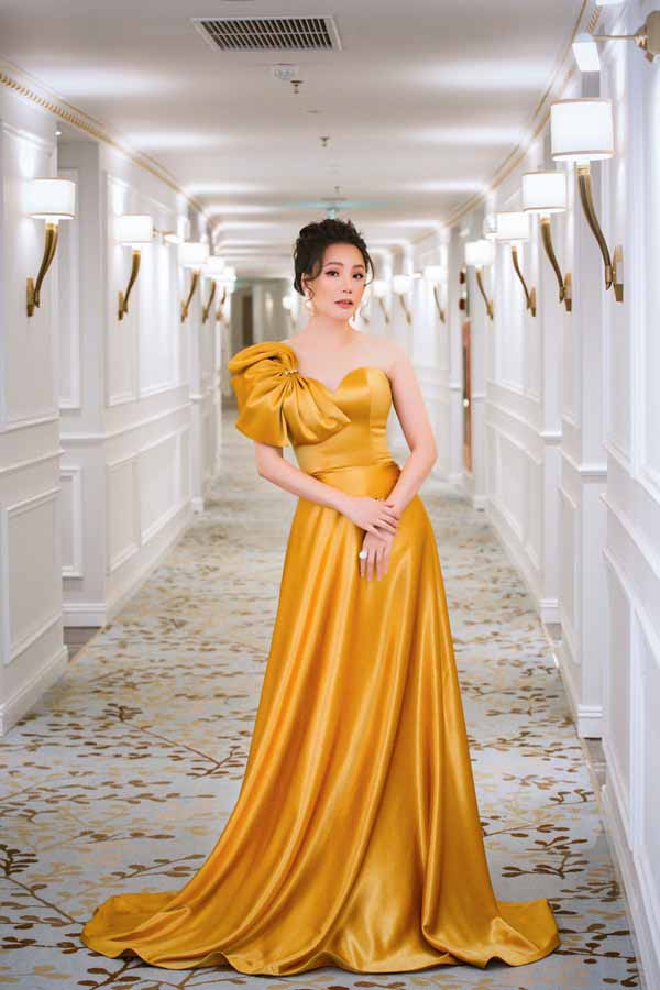 Hồ Quỳnh Hương rạng rỡ xuất hiện trong chiếc đầm vàng mù tạt lệch vai tại đêm ‘Gala Sao Mai trở về đất mỏ’.