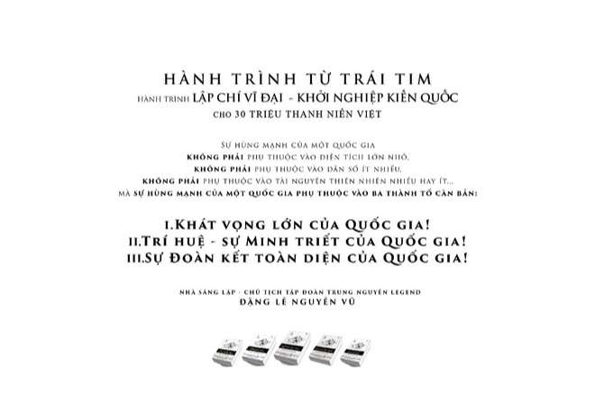 “Hành trình Từ Trái Tim – Hành trình Lập Chí Vĩ Đại – Khởi Nghiệp Kiến Quốc cho 30 Triệu Thanh Niên Việt” do Tập đoàn Trung Nguyên Legend khởi xướng nhằm kiến tạo Khát Vọng Lớn, Chí Hướng Vĩ Đại cho thế hệ Thanh Niên Việt Nam; xây dựng Trí Huệ và sự Minh Triết toàn diện cho 30 triệu Thanh niên Việt thông qua việc trao tặng hàng chục triệu cuốn sách quý đổi đời tới Thanh niên Việt để có sức mạnh tri thức đúng đắn và toàn diện, để từ đó chuyển hóa thành sức mạnh tinh thần, sức mạnh vật chất và sức mạnh thể chất, tạo nên sức mạnh của Quốc gia. “Tủ sách nền tảng đổi đời” gồm hơn 100 đầu sách quý được CHỦ TỊCH Tập đoàn Trung Nguyên Legend ĐẶNG LÊ NGUYÊN VŨ tâm huyết, cẩn trọng tuyển chọn từ hàng triệu cuốn sách, từ hàng ngàn tấm gương danh vĩ nhân thành công nhất của nhân loại. Tủ sách thấm đẫm tư duy biện chứng, tuần hoàn liên thông từ lập thuyết đến thực hành, hợp nhất tinh hoa của toàn nhân loại để giúp học hỏi toàn diện và đúng đắn về 12 lĩnh vực căn cốt nhất: Khoa Học, Triết Học, Huyền Học, Y Học, Võ Học, Kinh Tài Học, Chính Trị Học, Đạo Đức Học, Xã Hội Học, Mỹ Học, Âm Thanh Học và Ngôn Ngữ Học. Trong đó, 5 cuốn sách “Nghĩ Giàu Làm Giàu”, ‘Khuyến Học”, “Quốc Gia Khởi Nghiệp”, “Đắc Nhân Tâm”, “Không Bao Giờ Là Thất Bại – Tất Cả Chỉ Là Thử Thách” là những cuốn sách mở đầu của “Tủ Sách Nền Tảng Đổi Đời”. Từ năm 2018 – 2023, “Hành trình Từ Trái Tim” mong muốn trang bị đến hơn 20 triệu hộ gia đình, mỗi hộ gia đình là một thư viện ánh sáng tri thức toàn diện; từng “Tủ Sách Nền Tảng Đổi Đời” đến 11.085 nhà văn hoá xã; 212 nhà văn hoá quận; 1.642 nhà văn hoá huyện, thị trấn; 1.135 nhà văn hoá phường; thư viện của 713 đơn vị hành chánh gồm: 68 thành phố trực thuộc tỉnh, 50 thị xã, 49 quận và 546 huyện; trang bị toàn bộ hệ thống thư viện các cơ quan Nhà nước, tổ chức xã hội,… và 30 triệu thanh niên trên mọi miền Tổ Quốc. Số lượng sách dự kiến đạt tới trên 200 triệu cuốn, với nguồn lực chi phí cần có là gần 5 tỉ đô la. Trung Nguyên Legend hy vọng và tin rằng, Hành trình sẽ nhận được sự hưởng ứng, hội tụ, đoàn kết, lan tỏa và được tổ chức sâu rộng hơn, rộng khắp hơn trên mọi miền đất nước; cùng sự đồng hành ủng hộ của các cơ quan, tổ chức, đoàn thể xã hội, các doanh nghiệp, các mạnh thường quân, các nhân vật ảnh hưởng, giới tinh hoa, truyền thông…vì một Chí Hướng Lớn, vì một Khát Vọng Vĩ đại, Khởi Nghiệp Kiến Quốc không chỉ cho 30 triệu thanh niên Việt mà cho mọi gia đình, mọi công dân Việt Nam. Với nguồn lực còn hạn chế về nhân lực, vật lực… nhưng Tập đoàn Trung Nguyên Legend sẽ thực hiện bằng Tâm Thiện Lành và trách nhiệm cao nhất. Đến nay, “Hành trình từ Trái Tim – Hành trình Lập Chí Vĩ Đại – Khởi Nghiệp Kiến Quốc cho 30 triệu Thanh niên Việt” đã có sự đồng hành của Bộ Quốc phòng, Bộ Giáo Dục & Đào Tạo, Bộ Văn hóa, Thể thao và Du lịch, Trung ương Đoàn – Hội Liên hiệp thanh niên Việt Nam… cùng nhiều cơ quan nhà nước, các tổ chức xã hội, các nhân vật ảnh hưởng trong nước và quốc tế; cùng các cơ quan truyền thông: Một Thế Giới, Thanh Niên, Soha, Tiền Phong…Hành trình đang tiếp tục tổ chức các chương trình hoạt động dành cho học sinh, sinh viên, thanh niên quân đội…tại hệ thống các trường Đại học, Học Viện, Cao đẳng, phổ thông trung học; hệ thống các nhà thư viện, nhà văn hóa… trên khắp cả nước và vùng biển đảo xa xôi nhất của tổ quốc. Thông tin chi tiết về ‘Hành trình từ Trái tim – Hành trình Lập Chí Vĩ Đại – Khởi Nghiệp Kiến Quốc cho 30 triệu Thanh niên Việt” liên tục được cập nhật tại www.hanhtrinhlapchividai.com hoặc https://www.facebook.com/lapchividai Triệu con tim chung một tấm lòng, vì khát vọng một Việt Nam hùng mạnh và ảnh hưởng toàn diện thế giới! |