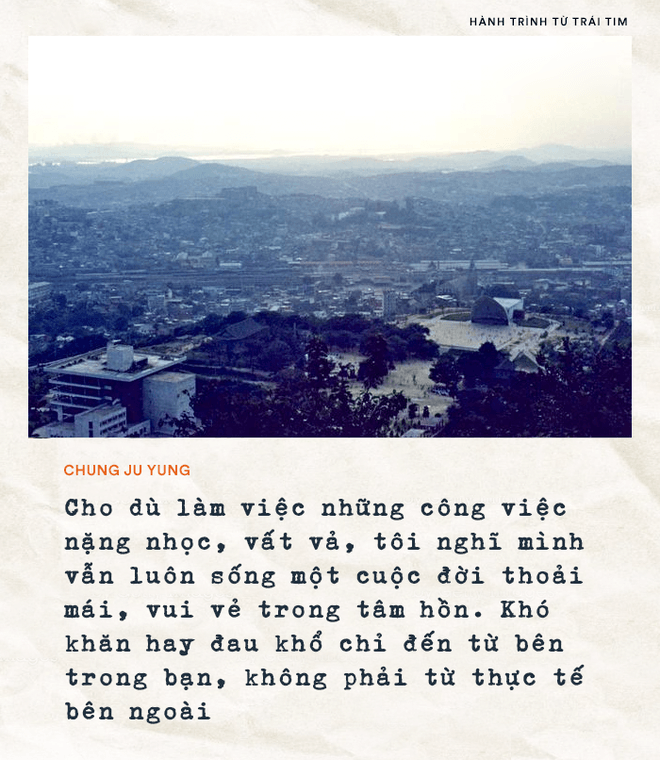 Để chứng minh cho chiêm nghiệm ấy, Chung Ju Yung nhớ lại kỉ niệm ngày nhỏ. Khi đó, dù mới 10 tuổi, ông đã phải theo cha ra đồng làm việc quần quật dưới trời nóng đổ lửa. Nếu là người tiêu cực thì có lẽ, họ sẽ chỉ nghĩ rằng mình làm việc vất vả dưới ánh nắng mặt trời mà không biết đến niềm hạnh phúc nào khác. Đối với họ, cuộc sống lúc nào cũng chỉ toàn khuyết điểm. Nhưng Chung Ju Yung không như vậy. Từ nhỏ, ông sớm học được cách sống hạnh phúc với hiện tại và hài lòng với những gì đang có. Thay vì than trách, tức giận, ông tranh thủ ngủ giấc ngắn dưới bóng râm, tận hưởng cơn gió mát mẻ như vào chốn cực lạc và cảm thấy mình thật hạnh phúc.