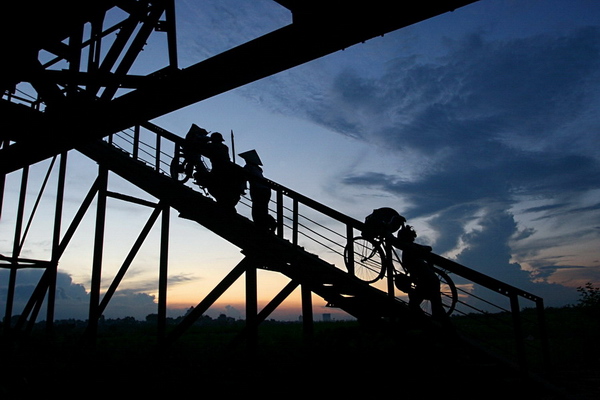 Những người nông dân từ bãi lên cầu trở về sau một ngày lao động