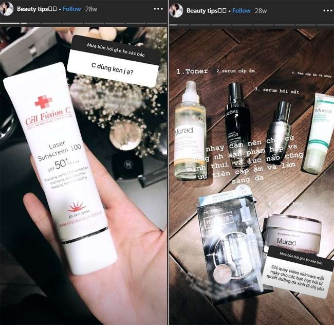 Bà mẹ một con cũng không ngại chia sẻ bí quyết chăm sóc da hàng ngày của bản thân. Kem chống nắng là bước không thể thiếu mỗi ngày của người đẹp sinh năm 1993 nhằm hạn chế tác hại từ tia UV lên da. Sản phẩm được cô tin dùng là kem chống nắng Cell Fusion C Laser Sunscreen có chỉ số SPF 50+.