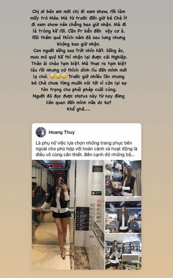 Mới đây, Á hậu Hoàng Thùy khiến khán giả tò mò khi đăng tải một story thể hiện thái độ bức xúc trên trang cá nhân. Á hậu Hoa hậu Hoàn Vũ Việt Nam đăng đàn sự việc liên quan đến lời mời xem show thời trang của một NTK. Cụ thể, nữ siêu mẫu thẳng thắn: “Chị ơi bên em mời chị đi xem show, rồi làm mấy trò Mèo. Mà từ trước tới giờ bé Chè ít đi xem show nên chẳng bao giờ nhận. Mà đi là trúng kế rồi. Cần Pr (truyền thông) bẩn đến vậy cơ à. Rồi thêm quả thích ném đá sau lưng nhưng chẳng bao giờ nhận”.