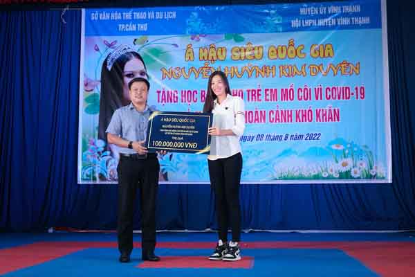 Giữ đúng lời hứa, Kim Duyên đã trích 100 triệu đồng trong số tiền thưởng cô nhận được sau khi lập một kỷ lục mới cho Việt Nam tại cuộc thi Miss Supranational cho hoạt động thiện nguyện lần này tại quê nhà. Cô trao tặng 100 phần học bổng, mỗi phần trị giá 1 triệu đồng tiền mặt dành cho những trẻ em nhỏ mồ côi vì COVID-19 và trẻ em có hoàn cảnh khó khăn tại địa phương.