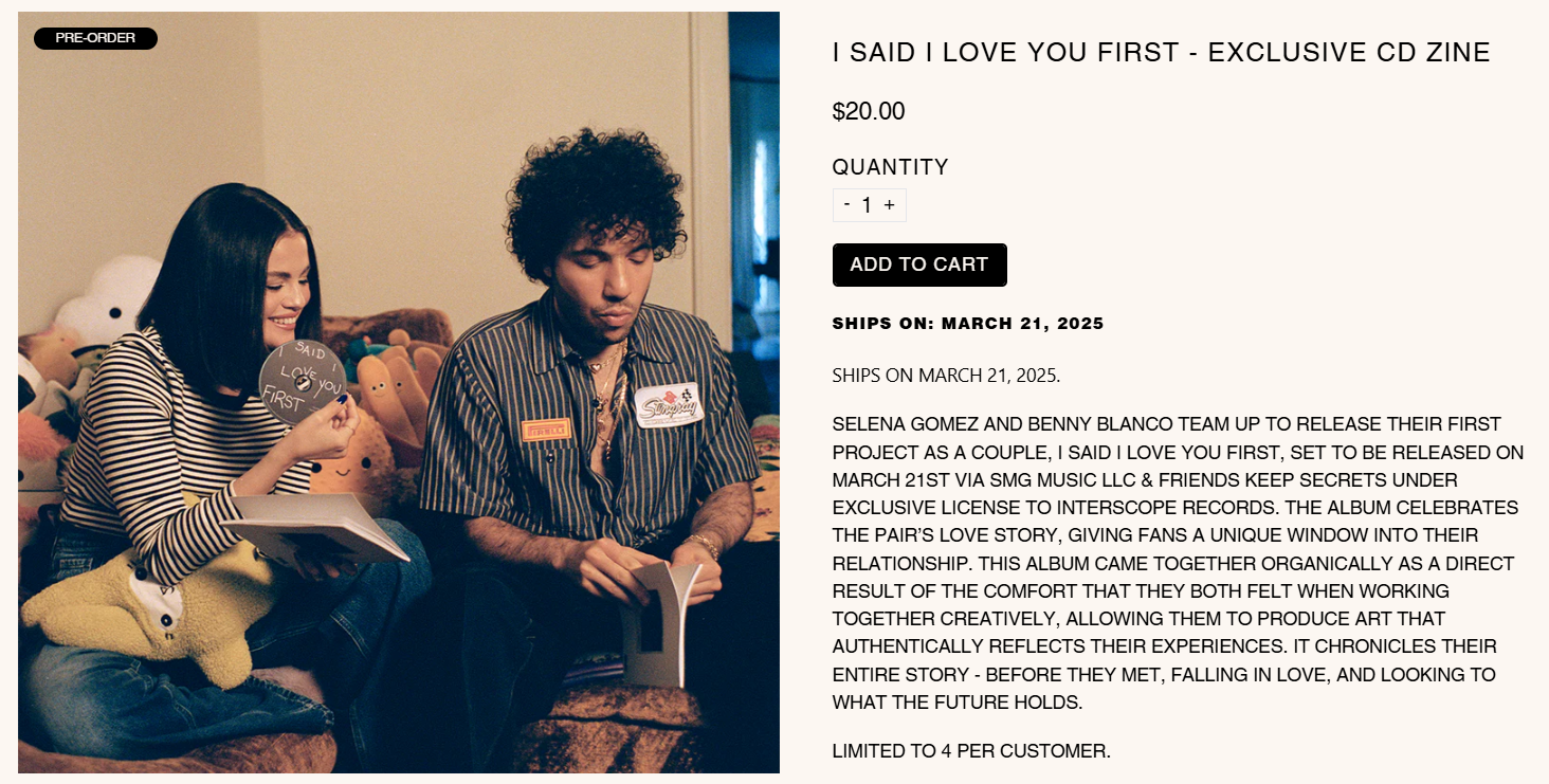 Album “I Said I Love You First” đánh dấu một chương mới trong sự nghiệp âm nhạc của Selena Gomez. Sau 4 năm vắng bóng, cô nàng đã trở lại với một dự án đầy ý nghĩa, đánh dấu sự hợp tác đặc biệt với người bạn đời của mình. Album không chỉ là những giai điệu ngọt ngào mà còn là những câu chuyện tình yêu chân thật, được Selena Gomez và Benny Blanco chia sẻ cùng khán giả. “I Said I Love You First” dự kiến sẽ ra mắt vào ngày 21/3 tới, hứa hẹn sẽ chạm đến trái tim của những người yêu nhạc.
