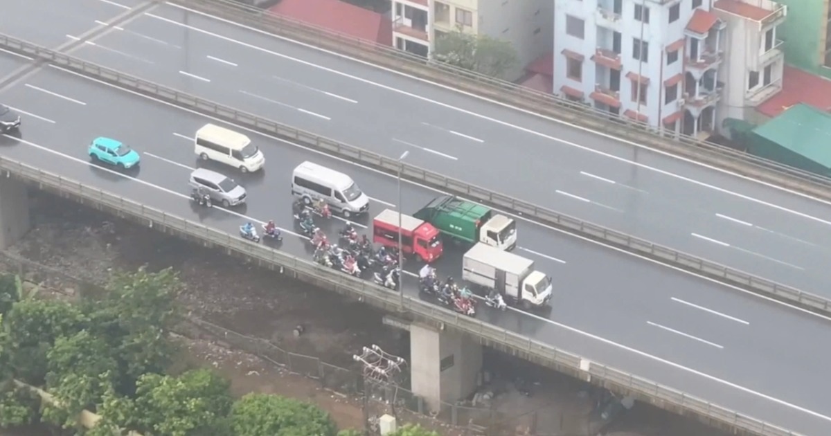 Hình ảnh những chiếc xe tải che cho xe máy trên cầu trong mùa bão Nguồn: Internet