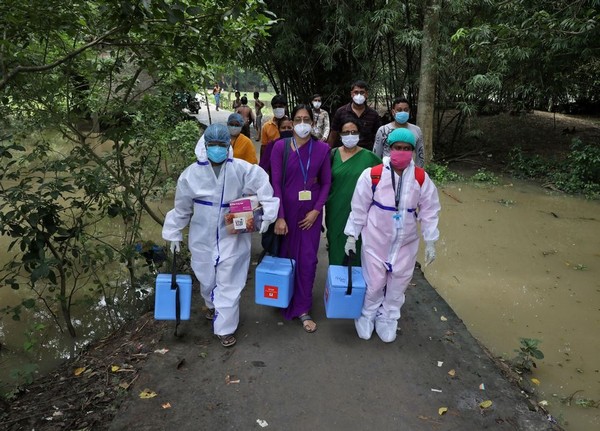 Các nhân viên y tế mang theo COVISHIELD, một loại vắc xin phòng COVID-19 do Viện Huyết thanh của Ấn Độ sản xuất, để tiêm cho dân làng trong quá trình tiêm chủng và thử nghiệm tận nhà tại Đảo Uttar Batora ở quận Howrah, bang Tây Bengal, Ấn Độ hôm 21.6