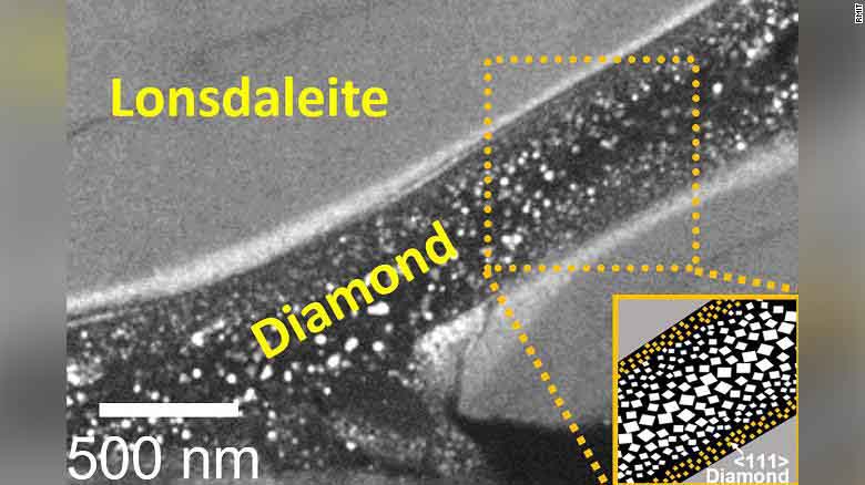 Nhiệt độ cực cao và áp suất tạo ra từ vụ va chạm khiến graphite biến thành kim cương nhưng vẫn giữ lại cấu trúc mạng tinh thể lục giác của graphite. Kim cương Lonsdaleite thực ra đã được tổng hợp trong phòng thí nghiệm từ năm 1966 bằng phương pháp nén và đưa graphite lên nhiệt độ cao ở áp suất tĩnh hoặc bằng các vụ nổ. Nó cũng được sản xuát bằng phương pháp lắng đọng hơi hóa học nhưng đây là lần đầu tiên nó được tạo ra ở nhiệt độ phòng.