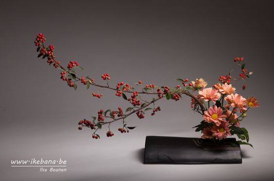 Trong những không gian kiến trúc tối giản của đất nước mặt trời mọc, nơi sảnh thờ rộng lớn hay những căn phòng nhỏ bé ấm áp, một bình hoa Ikebana vẫn sẽ gây ấn tượng cho bạn bởi những mảng màu hài hòa nhưng luôn có điểm nhấn ấn tượng. Đó có thể là những bông hoa tuy-lip màu tím đậm được cắm bên cạnh những nụ hoa đỏ rực rỡ hay những mảng lớn nhuộm sắc hồng của hoa súng. Để cân bằng với những mảng màu nóng thường sẽ là những cành khô khúc khuỷu, cũng có thể là những nhánh thông lá kim uốn lượn duyên dáng xung quanh và dường như là điểm tựa cho toàn bộ bố cục. Cách sử dụng hoa cỏ và sắp xếp trong Ikebana cần thể hiện được ý nghĩa của bốn mùa, của hiện tại, quá khứ hay tương lai.
