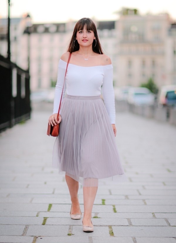 Một chiếc áo trễ vai ôm cùng chân váy voan sẽ cho bạn vẻ ngoài nữ tính hơn bao giờ hết.
