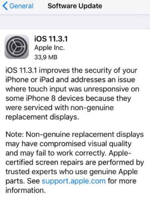 Theo Softpedia, bản cập nhật nhỏ đầu tiên iOS 11.3.1 không đem tới sự đổi mới nào. Thay vào đó, iOS 11.3.1 chỉ tập trung vá lỗ hổng bảo mật và sữa lỗi iPhone 8/8 Plus (thay màn hình không chính hãng) trở thành cục gạch sau khi nâng cấp lên iOS 11.3.