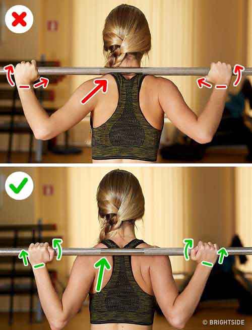 Việc tì thanh tạ trên cổ khi thực hiện bài tập đẩy đòn tạ sau đầu có thể gây chấn thương. Bạn nên mở rộng khuỷu tay ra sau, tay nắm thanh tạ như hình minh họa, đặt đòn tạ ngang bả vai hoặc thấp hơn nếu có thể.