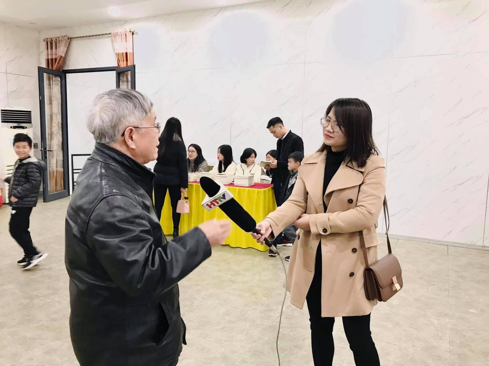 Nhà thơ Hoàng Vũ Thuật (trái) đang trả lời Đài Truyền hình về tập thơ “Bài thánh ca cho Anh”. Thi phẩm mà ông đã đánh giá rất cao với bài viết “Những kiến giải ban đầu về một hiện tượng thơ”.
