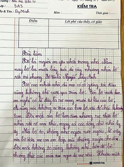 Cậu bé 10 tuổi còn cho thấy rằng em rất hay quan sát bố, hiểu về công việc của bố qua từng lời văn có lúc ngô nghê, có lúc lại hài hước, “bá đạo”: “Bố em làm nghề kiến trúc sư nên thiết kế ra hàng tỉ các ngôi nhà từ tầng 1 đến 20 tầng nên lương bố mỗi tháng là 20 triệu đồng. Bố có tính cách thức khuya dậy sớm nên đến tối mịt bố vẫn thức xem điện thoại, em hỏi thì bố nói: ‘Bố đang cày phim’. Bố thích ngồi trong nhà vệ sinh hàng tiếng đồng hồ để đọc sách tiếng Anh, nhờ vậy nên giao tiếp, lắng nghe phát âm… đều 10/10. Bố thấy cần nhiều tiền hơn nên lập trang Web chuyên bán đồ Online cho người nước ngoài.