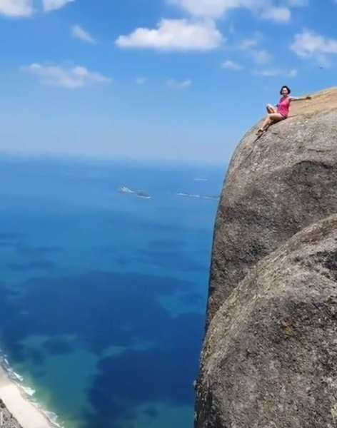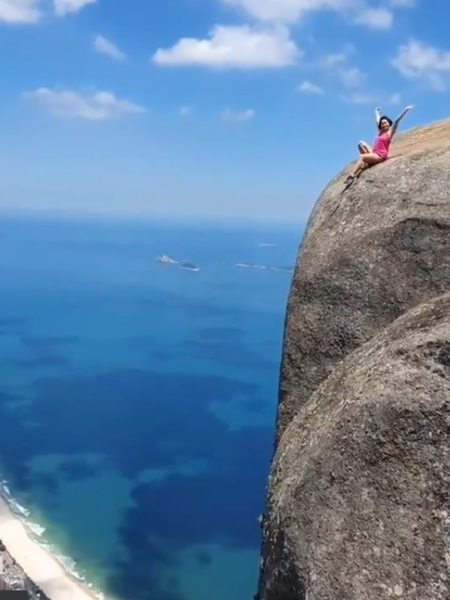 Nữ du khách đứng tạo dáng trên mỏm đá nhô ra ở độ cao gần 1.000 m của ngọn núi Pedra da Gávea (Brazil). Thậm chí, cô còn trượt xuống mặt đá và đưa tay lên trời khiến người xem hồi hộp, thót tim, lo sợ cô sẽ rơi xuống. Sau đó, máy quay lia sang trái để lấy toàn cảnh tuyệt đẹp của biển, núi và toàn thành phố. Điều đáng nói, đây là khu vực nguy hiểm đã được giới chức Brazil cảnh báo.
