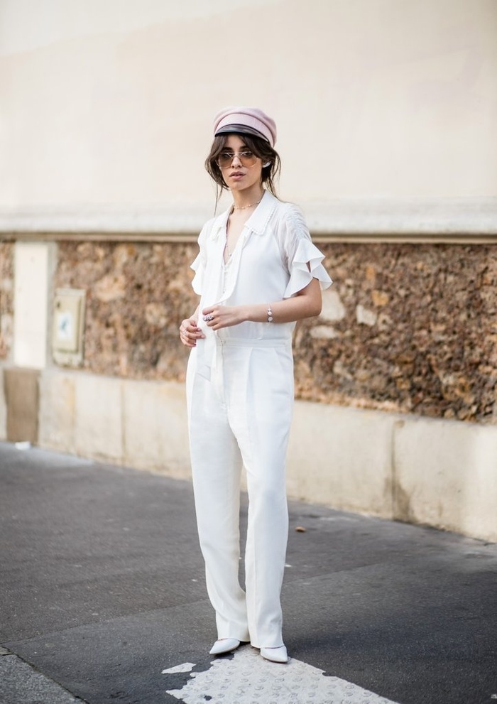 Jumpsuit màu trắng + mũ baker boy + giày cao gót