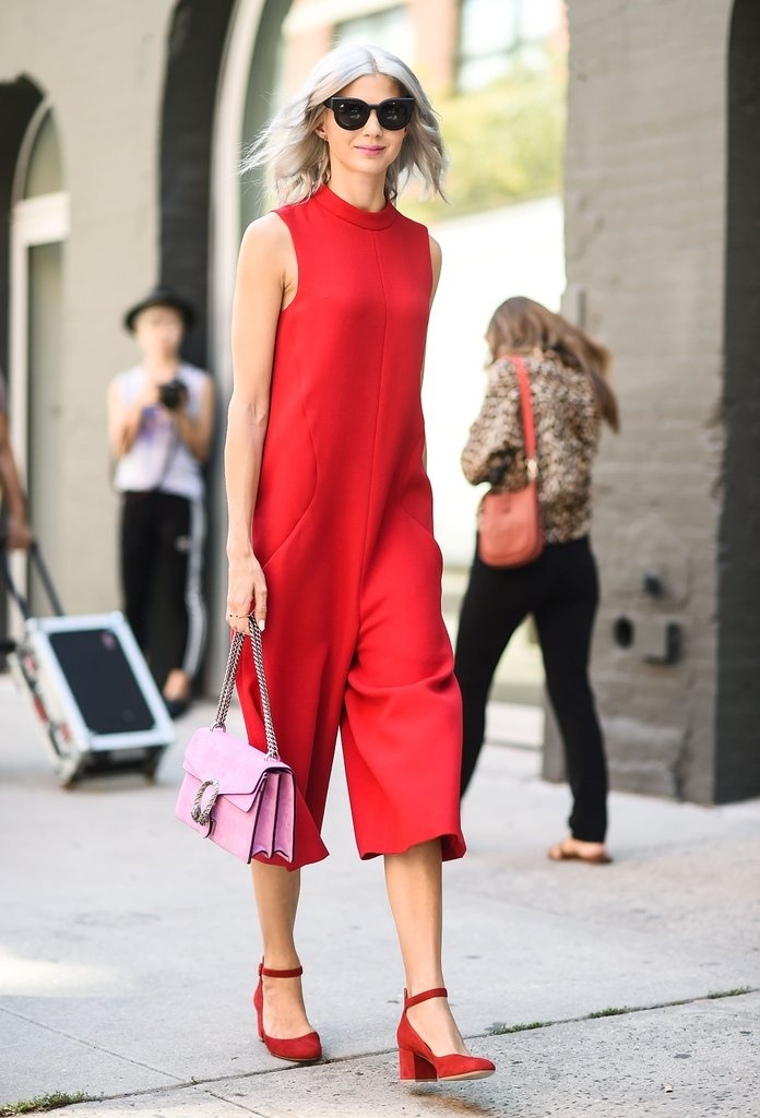 Jumpsuit màu đỏ + giày quai ngang màu đỏ + túi xách tay màu hồng