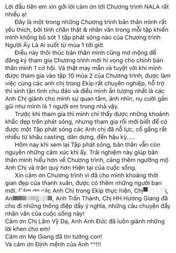 Việt Dũng chia sẻ lên trang cá nhân, cảm xúc mình vẫn khó tả vô vàn sau lần chạm trán Lê Lộc ở Người ấy là ai. Trong những dòng mới nhất, anh gửi lời cảm ơn đến Trấn Thành, Hương Giang… Đặc biệt nhất nhẹ nhàng gọi Lê Giang là “mẹ”. Tuy nhiên khán giả không nghe được bất cứ phản hồi nào về chuyện yêu Lê Lộc.