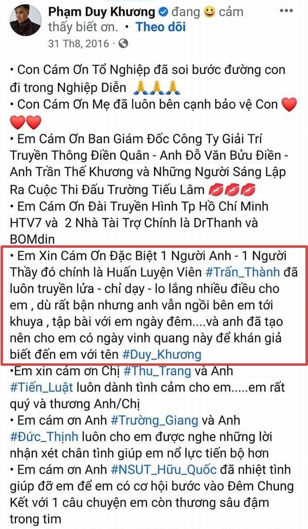Sự phũ phàng của Duy Khương khiến dân mạng bức xúc. Nhanh chóng, đã có một tài khoản tìm ra được bằng chứng anh từng công khai gọi Trấn Thành là thầy. Cụ thể, bài viết được Duy Khương đăng tải vào ngày 31/8/2016 – sau đêm chung kết “Đấu trường tiếu lâm” và anh xuất sắc giành ngôi vị cao nhất. Nguyên văn mà anh viết: “Em xin cảm ơn đặc biệt một người anh – một người thầy đó chính là huấn luyện viên Trấn Thành đã luôn truyền lửa – chỉ dạy – lo lắng nhiều điều cho em, dù rất bận nhưng anh vẫn ngồi bên em tới khuya, tập bài với em ngày đêm. Và anh đã tạo nên cho em có ngày vinh quang này để khán giả biết đến em với tên Duy Khương”.