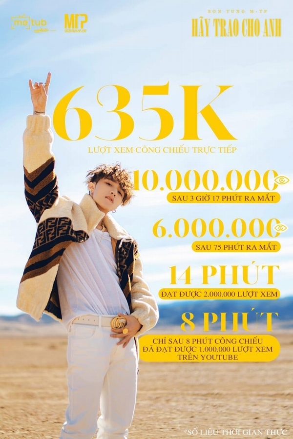 Trước đó, với MV ‘Chạy ngay đi’, Sơn Tùng M-TP cũng từng phá kỉ lục YouTube với 1 triệu lượt xem chỉ sau 18 phút phút, 2 triệu view sau 50 phút.