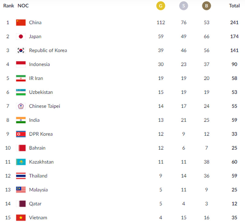 Trung Quốc vẫn dẫn đầu với 112 HCV, 76 HCB, 53 HCĐ. Đứng thứ hai là đoàn Nhật Bản với 59 HCV, 49 HCB, 66 HCĐ. Vị trí thứ 3 là Hàn Quốc với 39 HCV, 46 HCB, 56 HCĐ.