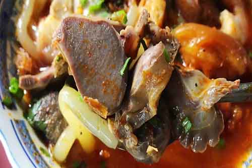 Thịt cua tại đây được bóc sạch nên ăn không bị lẫn vỏ. Đáng chú ý là mề gà được xắt to, nấu chung với nước dùng nên mềm và giòn. Khách nào tới ăn cũng hài lòng bởi miếng mề giòn sần sật, nhai trong miệng rất đã. Nước dùng co vị ngọt tự nhiên vì nấu từ cua. Mọi nguyên liệu này đều mua từ chợ từ sớm, để kịp mở cửa trước lúc 4 giờ chiều.