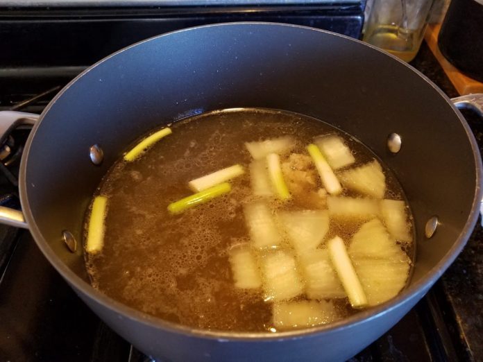 – Bắt nồi lên bếp, để lửa lớn, khi nồi nóng, cho 1 muỗng canh dầu ăn và phần hành đập dập vào xào hơi vàng, kế đến lần lượt cho vào nồi 2 muỗng canh nước mắm, 6 chén lớn nước lọc. Nêm vào nồi nước dùng 2 muỗng canh đường + 1 muỗng canh muối + 1 muỗng canh bột súp gà.
