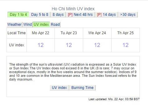 Theo Tổ chức Y tế Thế giới (WHO), chỉ số UV cao nhất là 11+ với thời gian gây bỏng là 10 phút. Đặc biệt, ánh nắng mặt trời mạnh và có hại nhất vào lúc 10-15h.
