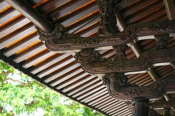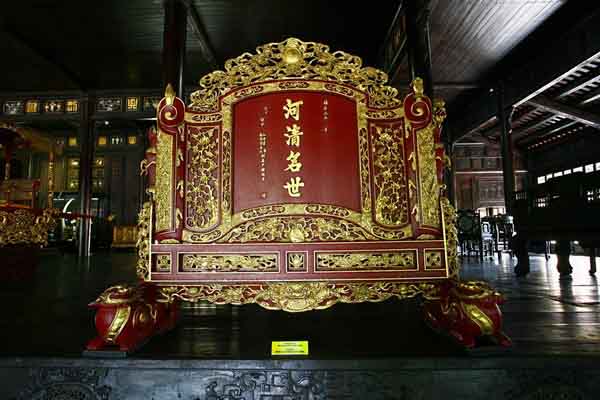 Công trình là một tòa nhà kép theo lối kiến trúc “trùng thiềm điệp ốc”, đặt trên một nền cao 1,1m, rộng 35,7x28m, vỉa ốp đá Thanh. Hệ thống bậc cấp dẫn lên thềm cũng làm bằng đá Thanh với thành bậc được trang trí rồng rất tinh xảo. Toàn bộ hệ kết cấu được làm bằng gỗ với 128 cột gỗ lim.