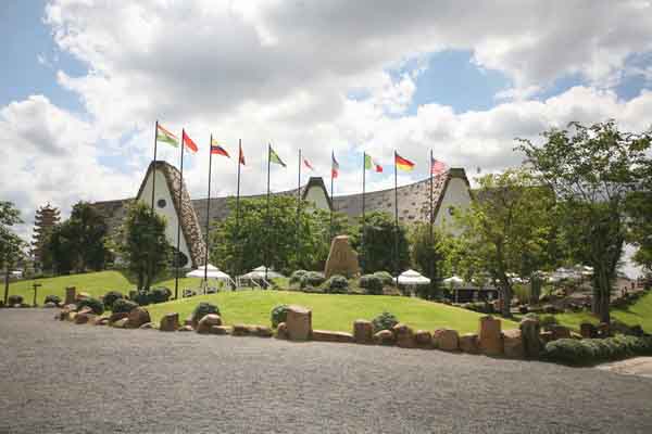 Với công trình bảo tàng, theo logic của thị giác, kiến trúc là một yếu tố quan trọng. Sự lôi cuốn và hấp dẫn của bảo tàng trước hết đến từ hình thức kiến trúc bên ngoài rồi mới đến không gian trưng bày ở trong. Kiến trúc của Bảo tàng Thế giới đã làm được điều đó. Công trình là một tổ hợp các khối uốn cong khá tự do, được kết nối với nhau qua những “điểm chạm” trên các đường cong. Tổng cộng có 5 khối uốn lượn như vậy. Dễ dàng nhận ra dấu ấn bản địa trên hình khối kiến trúc. Đó là hình ảnh ngôi nhà dài của người Ê Đê và bộ mái vút cao của nhà rông – những biểu tượng của kiến trúc Tây Nguyên. Với bố cục phân tán, công trình cho một cảm giác dàn trải, nhẹ nhàng và hòa hợp với thiên nhiên.