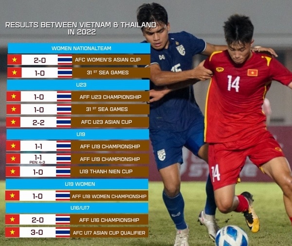 Theo đó, ở bóng đá nữ, tuyển nữ Thái Lan để thua tuyển nữ Việt Nam 2 trận tại vòng chung kết Asian Cup nữ đầu năm nay ở Ấn Độ tỷ số 0-2, và 0-1 ở chung kết SEA Games 31. Đội U.19 nữ Thái Lan cũng thua U.19 nữ Việt Nam 0-1 ở giải vô địch Đông Nam Á.