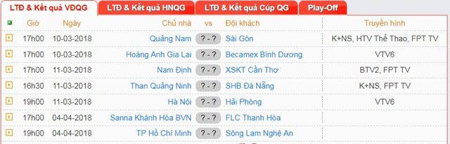 Như vậy, lịch thi đấu vòng 1 V-League, đài truyền hình VTV6 sẽ tường thuật trực tiếp trận đấu giữa HAGL gặp B.Bình Dương (10/03) và Hà Nội FC gặp Hải Phòng (11/3). K+PM, HTV Thể thao, FPT TV trực tiếp trận khai mạc trên sân Tam Kỳ giữa Quảng Nam gặp Sài Gòn FC (10/3). Một ngày sau đó, K+PC lẫn FPT TV sẽ phát trận đấu giữa Than Quảng Ninh gặp SHB Đà Nẵng (11/3) và BTV2 và FPT TV trực tiếp trận Nam Định gặp XSKT Cần Thơ.