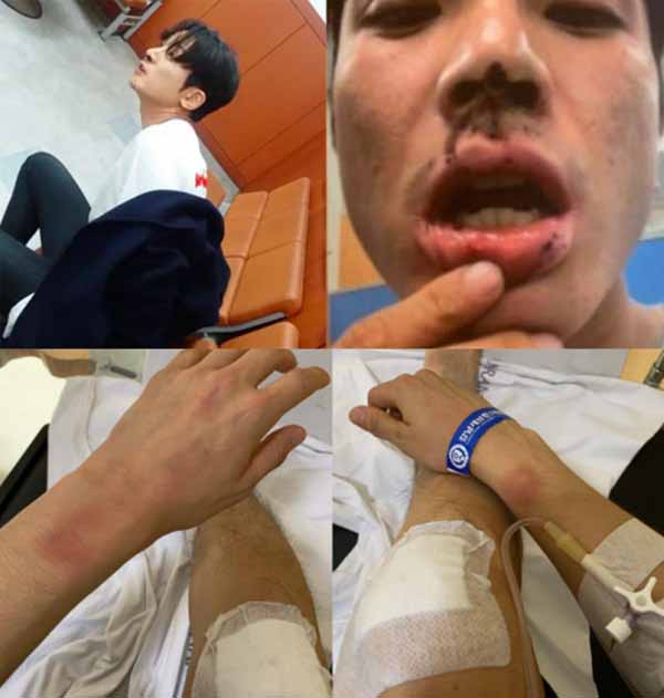 Anh Kim Sang Kyo cho biết, sau đó mình bị lôi ra khỏi club và bị kéo đến một góc tối không có CCTV. Người đàn ông quấy rối tình dục cô gái kia cùng đám bạn và nhân viên bảo vệ liên tục đánh, đạp vào người anh. Sau khi quản lý và bảo vệ quay vào trong club, anh Kim nhanh chóng gọi điện cho cảnh sát cầu cứu. Cảnh sát xuất hiện ngay sau đó nhưng thay vì bắt giữ những kẻ hành hung lại đưa anh Kim Sang Kyo về đồn. Theo hồ sơ cảnh sát, anh Kim là người có hành vi quấy rối tình dục, phá hoại đồ đạc còn quản lý club lại là nạn nhân.