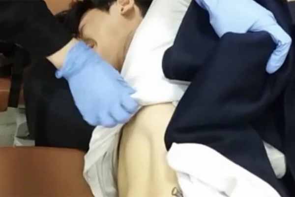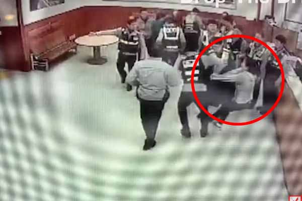 Chứng kiến cảnh tượng này, mẹ Kim Sang Kyo đã lấy điện thoại ghi hình để cảnh sát dừng đánh đập con trai. Cảnh sát phát hiện hành động của bà liền túm lấy mẹ Sang Kyo để giành điện thoại, tiêu hủy chứng cứ. Hơn một tiếng sau, anh Kim tiếp tục bị chuyển đến đồn cảnh sát Gang Nam. Tại đây, hai nhân viên bảo vệ hành hung Sang Kyo cũng được gọi đến. Tuy nhiên, hai người này đổ lỗi Kim Sang Kyo quấy rối tình dục người phụ nữ đó nên đã đến can ngăn. Sau 8 tiếng đồng hồ bị giam giữ, anh Kim được đưa đến bệnh viện và được chẩn đoán bị rạn nứt xương sườn, liệt ngón tay cùng nhiều vết thâm tím, chảy máu.