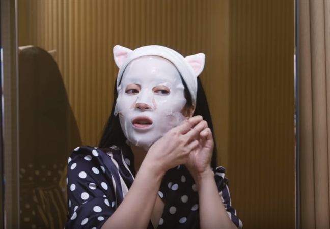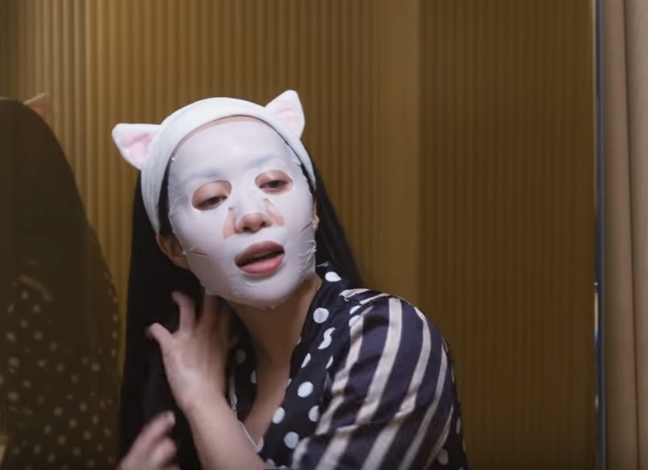 Sau khi thoa đều lượng dầu dưỡng tóc, Michelle Phan lột lớp mặt nạ nhẹ nhàng từ trán xuống và dùng tay massage lần nữa khắp khuôn mặt, giúp dưỡng chất thấm sâu hơn vào da.