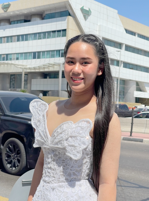 Phần eo corset kết hợp cùng tùng xoè chữ A đuôi dài tôn lên vòng eo và vóc dáng thon gọn của người mặc. Dưới ánh nắng rực rỡ của Dubai, những du khách đang trú cùng khách sạn thích thú ghi lại hình ảnh của Bella Vũ khi cô bé xuất hiện. Vì NTK Nguyễn Minh Tuấn đã khéo léo thiết kế những hạt đá nhỏ lấp lánh khắp phần tùng váy.