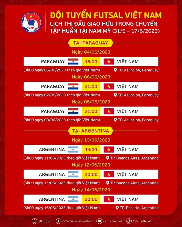 Lịch thi đấu giao hữu của ĐT Futsal Việt Nam trong chuyến tập huấn tại Nam Mỹ